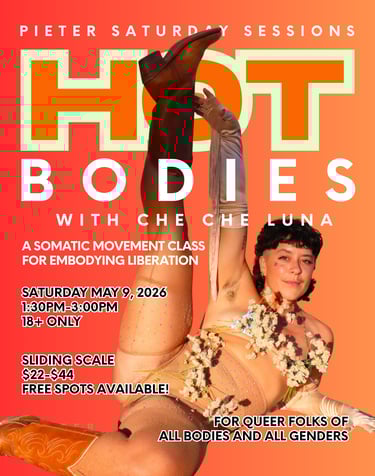 Hot Bodies is a 90 minute somatic movement class for queer folks who are longing to move, feel, embody liberation, and be together beyond enduring, performance, compliance and productivity. This gathering invites you to soften your mind, listen to your body’s impulses, and reconnect with the erotic intelligence that lives within your tissues. Through guided sensual somatic prompts and collective care, we’ll explore what it feels like to be hot with aliveness, bodies in our truth, and deeply queer in community.